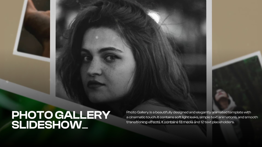 Watch TrailerPhoto Gallery is a beautifully designed and elegantly animated template with a cinematic touch. It contains soft light leaks, subtle screen dirt overlays, simple text animation, and smooth transitioning effects. It contains 13 media and 12 text placeholders.